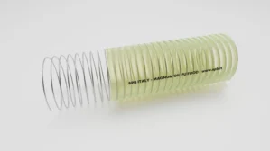Tubo atossico, flessibile e robusto in poliuretano trasparente con spirale di rinforzo in acciaio zincato antischiacciamento. Superficie liscia interna ed esterna. Ideale per aspirazione e mandata di liquidi in agricoltura, edilizia e industria.
